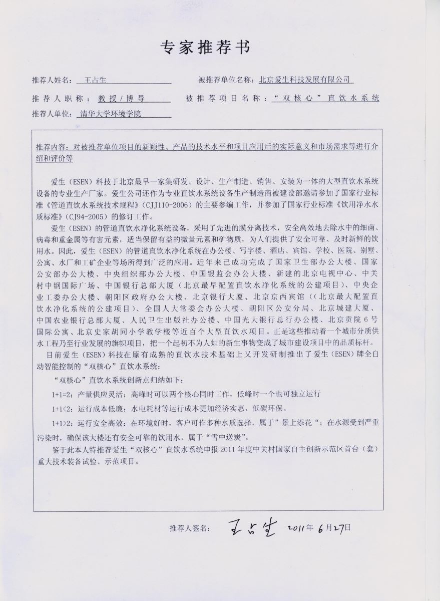 愛生(ESEN)是中國致力于大型管道直飲水凈化系統(tǒng)設(shè)備研發(fā)和生產(chǎn)的國家級高新技術(shù)企業(yè),為廣大客戶提供高品質(zhì)的樓宇直飲水設(shè)備解決方案,17年來愛生公司已成功為國家衛(wèi)生部辦公大樓、國家公安部辦公大樓、中央組織部辦公大樓、國家體育總局辦公大樓、中國銀監(jiān)會辦公大樓、中央企業(yè)工委辦公大樓、北京電視中心(BTV)、中關(guān)村中鋼國際廣場、中國銀行總部大廈(北京最早配置直飲水凈化系統(tǒng)的公建項(xiàng)目)、國家開發(fā)銀行總行辦公大樓、北京銀行總行大廈、北京京西賓館、全國人大常委會辦公大樓、朝陽區(qū)公安分局,朝陽區(qū)政府辦公大樓、北京城建大廈、中國農(nóng)業(yè)銀行總部大廈、北京貢院6號國際公寓、北京史家胡同小學(xué)本部等定制設(shè)計(jì)了一百多個(gè)大型直飲水工程項(xiàng)目。