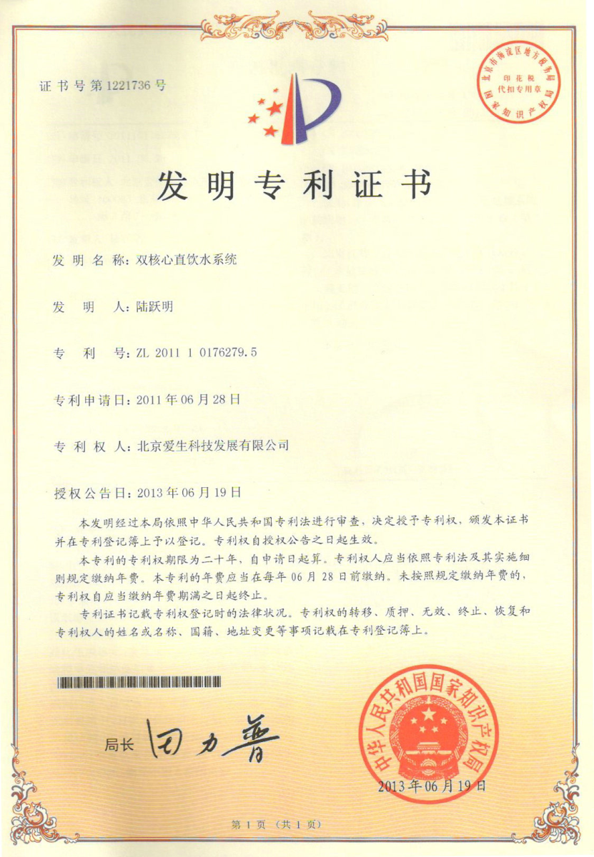 本項(xiàng)目是愛生”雙核心直飲水系統(tǒng)“新技術(shù)在工程上的首次應(yīng)用,與中國光大銀行合作,該項(xiàng)目被認(rèn)定為”中關(guān)村國家自主創(chuàng)新示范區(qū)首(臺)套重大技術(shù)裝備示范項(xiàng)目“,是愛生科技在總結(jié)大型直飲水凈化系統(tǒng)設(shè)計(jì)經(jīng)驗(yàn)和用戶在安全和節(jié)能方面更高的使用需求基礎(chǔ)上,通過兩個(gè)核心過濾技術(shù)的有機(jī)結(jié)合,結(jié)合運(yùn)用自控自檢技術(shù),合理的設(shè)置膜單元流量參數(shù),包括膜單元濃水循環(huán)流量和膜單元濃水排放流量,合理調(diào)整各個(gè)膜段的入水量和產(chǎn)水量及壓力,提高其產(chǎn)水量,降低濃廢水的比例。同時(shí)通過與廢水裝置和中水系統(tǒng)的整合設(shè)計(jì),廢水利用率達(dá)到100%,并且“雙核心直飲水系統(tǒng)”從控制角度和處理工藝上更高效地對安全飲水給予了充分保障,完全規(guī)避了由于水源突發(fā)性污染或自然災(zāi)害等突發(fā)事件而帶來的對直飲水出水水質(zhì)的影響。對直接飲用水安全的保證及和諧社會的建設(shè),即飲水安全是建設(shè)和諧社會的基礎(chǔ)和支撐有著現(xiàn)實(shí)的實(shí)際意義。