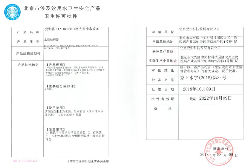 2018年8月底,愛生在長達十個月準備的新一期衛(wèi)生批件申請,一次通過北京疾控中心組織的專家上會評審,產(chǎn)品及能力均獲專家首肯;2018年11月,經(jīng)北京市衛(wèi)生和計劃生育委員會批準,愛生拿到了第5張批件許可,成為北京地區(qū)為數(shù)不多的具備大型直飲水設(shè)備制造能力的專業(yè)企業(yè)。